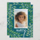 Eine moderne frohe Weihnachtskarte mit botanischen Blätter und Beeren - grün, weiß und aquamarin. Das moderne Design umfasst Eukalyptuszweige sowie Beeren- und Sans-Serifen für den Hauptteil des Textes. Der Gruß ist in einer rustikalen modernen Schrift. Auf der Rückseite befindet sich ein Eukalyptusmuster in Grüntöne und Weiß.