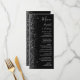 Die links Seite dieses eleganten, modernen Hochzeitsmenüs besticht durch ein silbernes Imitat-Glitzer-Design. Der anpassbare Text kombiniert silbergraue Handschrift, Kupferplatte und kursiv Schriftart auf schwarzem Hintergrund. Auf der Rückseite ist ein passendes Schwarz-Silber-Glitzer-Design erkennbar.