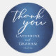 Schöne dunkelblaue Farbtöne schaffen eine Textur wie Wasser auf diesem Abend Gastgeschenk Hochzeit Aufkleber. Perfekt am See oder am Wasser bedanken sich bei den Aufklebern für eine Zeremonie am See mit Blick auf das Wasser. Elegantes, weißes, minimalistisches Skript mit Ihren Details über einen Verlauf, der sich anfühlt, als ob Sie unter Wasser schwimmen.