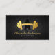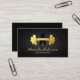 Elegante Fitness Trainer Visitenkarten mit einem stilvollen, schwarzen Hexagon Hintergrund mit einem gebogenen goldfarbenen Fitnessstudio, Ihrem Namen, Titel, Kontaktdetails und Social Media Icons.