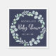 Eine moderne Babydusche, die zu unserem einladenden Set passt, mit einem marinen Hintergrund, blauen Eukalyptuskränzen in Aquarellfarbe und weißem Text in Sans Serif und handgeschriebenem Schriftart. Persönlich mit Ihrem Namen und Ihrem Duschdatum.
