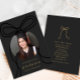 Dieses elegante Foto der Black and Gold Graduation Party Ankündigung Datum freihalten mit einem schicken schwarzen Bogen mit modernem kreisförmigem Foto auf einem schlichten schwarzen Hintergrund und Save the Date Graduiertendetails mit einem goldenen Bogen auf der Rückseite.
