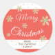 Ein moderner und stilvoller Weihnachtsaufkleber. Personalisierbarer Urlaubsticker - Text Frohe Weihnachten in trendigem, weißem Skript, und Ihr Familienname. Der Aufkleber hat grüne Schneeflocken auf einem roten Hintergrund.