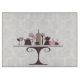 Moderne Damask Kitchenware Schneidebrett. Ein eleganter Damast-Hintergrund mit Kaffee-/Teeservice, Weingläsern und dekorativen Flaschen.