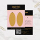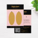 Die moderne Dangle Ohrringe Jewelry Display Card hat eine Reihe von Variationen zur Auswahl: Rosa, Blau, Beige und Weiß. Die schwarze obere Leiste zeigt den Markennamen, die Website am schwarzen Frontstrip, während hinten der Geschäftssitz, der Kontakt, der soziale Griff und der QR-Code sind; der mittlere Vordergrund in Rosa markiert zwei Ovale für bestimmte Ohrringe wie Winkel, Tropfen oder lange Ohrringe; und hinten in der Mitte ist der rosa Hintergrund die Produktbeschreibung und die Schmuckpflege.