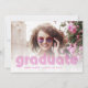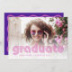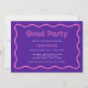 Diese trendige und stilvolle Graduiertenparty lädt mit einem Foto des Absolventen und Retro-Disco-Stil-Typografie zu einem aktuellen Werbespruch ein. Auf der Rückseite der Karte ist Platz, um alle Details zum Party hinzuzufügen. Die Vorderseite der Karte hat einen stylischen dunkelrosa Text, und die Rückseite der Karte ist farbenfroh lila und rosa mit einem trendigen, gewellten Rahmen.
