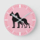 Schlichte, feine Uhrmarken in weiß und rot, dezent. Dazu zwei Doggen Silhouetten in schwarz. Eine kupiert, eine nicht kupiert. Eine aus der Geschichte, eine so wie sie sein soll und wie es besser ist, mit natürlichen Hängeohren!