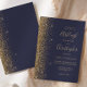 Die links Kulisse dieser modernen Hochzeitseinladung besticht durch einen vergoldeten Glitzer mit Imitaten. Der individuell anpassbare Text kombiniert blassgoldene Handschrift, Copperplate und kursiv Schriftart auf dunkelblauem Hintergrund. Auf der Rückseite ist ein passendes dunkelblau-goldenes Glitzer-Design.