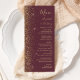 Die links Seite dieses eleganten, modernen Hochzeitsmenüs besticht durch das Design eines vergoldeten Glitzer mit Imitaten. Der individuell anpassbare Text kombiniert blassgoldene Handschrift, Copperplate und kursiv Schriftart auf dunkelburgundigem Hintergrund. Auf der Rückseite ist ein Bordeaux- und Goldmotiv-Glitzer in einem passenden Design.