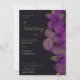 Ein reichhaltiger, eleganter Kranz aus lila Orchideen und Fuchsienorchideen, handgemalt in lebhaften, aber harmonischen lila, Fuchsia-, Rosa- und Indigotönen, sorgen für eine moderne, elegante und dennoch schicke Hochzeitsinie mit einem dunklen, launischen, schwarzen und lila Thema. Die elegante Kalligraphie, in der goldenen Farbe, macht diese stilvolle Schwarz-lila Einladung noch eleganter.