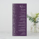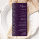 Die links Seite dieses eleganten, modernen Hochzeitsmenüs besticht durch ein silbernes Imitat-Glitzer-Design. Der anpassbare Text kombiniert silbergraue Handschrift, Kupferplatte und kursiv Schriftart auf einem dunklen lila Hintergrund. Die Rückseite ist mit einem lila und silbernen Glitzer-Design ausgestattet.