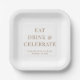 Moderne White Paper Teller für Ihre Hochzeitsfeier, Probe Dinner, Verlobungsfeier und andere Hochzeitsveranstaltungen mit "Eat Drink & Celebrate", Ihren Vornamen und Ihrem Hochzeitsdatum in eleganter Goldserf-Typografie.