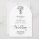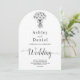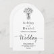 Diese elegante Schwarzweiß-Bogenhochzeit lädt zu einer modernen Hochzeit ein. Das einfache Design zeichnet sich durch eine elegante schwarze Kalligraphie und eine Braut- und Bräutigam-Illustration auf einem sauberen, weißen Hintergrund aus. Die Einladungskarte enthält die Hochzeitsdetails auf der Rückseite, anstatt für eine separate Kapselkarte zu bezahlen.