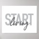 Modernes, einfaches, minimales typografisches Design eines Sprichworts "Start Living" in Grautönen. Coole, urbane, trendige grafische Vektorkunst mit handgeschriebener Typografie.