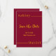 Diese elegante Bordeaux- und Goldhochzeit bewahrt das Datum für eine moderne Hochzeit und bietet elegante Goldkalligraphie auf bordeauxrotem Hintergrund.