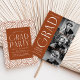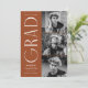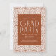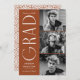 Trendy Graduation Party lädt mit den drei Fotos des Absolventen rechts neben dem Design in einem vertikalen Layout. "Grad" wird in weißem, modernem Deko mit Rosthintergrund dargestellt. Personalisieren Sie die moderne Foto Graduation Party einladen, indem Sie den Namen des Absolventen, Abschluss Jahr und Schulname. Das Design kehrt sich um, um die Details Ihrer Graduierungsparty mit einem rostbraunen und weißen geometrischen wirbelnden Hintergrund anzuzeigen. Perfekt für Uni-Abschluss und Gymnasiasten!