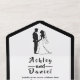 Diese elegante Schwarzweiß-Bogenhochzeit lädt zu einer modernen Hochzeit ein. Das einfache Design zeichnet sich durch eine elegante schwarze Kalligraphie und eine Braut- und Bräutigam-Illustration auf einem sauberen, weißen Hintergrund aus.