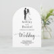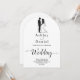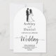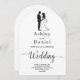 Diese elegante Schwarzweiß-Bogenhochzeit lädt zu einer modernen Hochzeit ein. Das einfache Design zeichnet sich durch eine elegante schwarze Kalligraphie und eine Braut- und Bräutigam-Illustration auf einem sauberen, weißen Hintergrund aus. Die Einladungskarte enthält die Hochzeitsdetails auf der Rückseite, anstatt für eine separate Kapselkarte zu bezahlen.