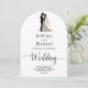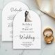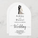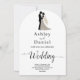 Diese elegante Schwarzweiß-Bogenhochzeit lädt zu einer modernen Hochzeit ein. Das einfache Design zeichnet sich durch eine elegante schwarze Kalligraphie und eine Braut- und Bräutigam-Illustration auf einem sauberen, weißen Hintergrund aus. Die Einladungskarte enthält die Hochzeitsdetails auf der Rückseite, anstatt für eine separate Kapselkarte zu bezahlen.