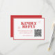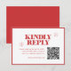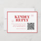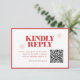 Eine moderne RSVP-Karte mit fett rotem Akzent und schlichtem monochromen Design, komplett mit einem scannbaren QR-Code für mühelos reagierende Gäste. Geschmackvoll und stilvoll eingerichtet, ideal für technisch versierte Hochzeiten.