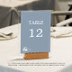 Eine moderne und einzigartige Tischnummer, die den Namen der Braut und des Bräutigams in staubblauer Farbe trägt. Personalisieren Sie Ihre eigene Dusty Blue Hochzeit mit diesem Design und Farbe in unserer Sammlung.