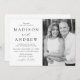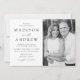 Moderne Foto Hochzeitseinladung mit Ihren Hochzeitsdetails über das verlassen Design in schwarzer Schrift mit Kalligraphie-Schriftzeichen-Akzenten. Personalisieren Sie die Vorderseite der Einladung, indem Sie Ihre Namen, Hochzeitsdetails und vertikale Verlobung Foto. Die Rückseite der Einladung bietet Platz für zusätzlichen Text und Fotos. Entworfen, um mit unserer Hochzeitskollektion "Moderne Elegance" zu koordinieren.