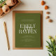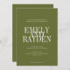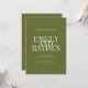 Die Einladung zur Hochzeit zeichnet sich durch ein minimalistisches Design mit olivgrünem Hintergrund und einer sauberen, symmetrischen Anordnung aus. Es verwendet elegante Serif-Schriftart, wobei die Namen des Ehepaares in einem großen, überlappenden Text für eine kühne und moderne Touch hervorgehoben dargestellt werden. Die übrigen Details sind in einem kleineren, klaren Schriftart angeordnet, wobei die Einfachheit und Eleganz gewahrt bleiben und zeitgenössische und traditionelle Ästhetik kombiniert werden.