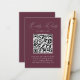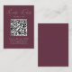 Mit diesen modernen Hochzeitskarten mit QR-Code können Sie Ihre Hochzeit oder Veranstaltung ganz einfach UAWG machen. Die eleganten Hochzeitszimmerkarten zeigen "Kindly Reply" in einem weißen, modernen Drehbuch mit weinfarbenem Hintergrund. Personalisieren Sie die Karte mit Ihrem UAWG, Ihrer Hochzeitswebsite und den Instruktionen für Gäste, die die Vorlagen verwenden. Auf der Kartenrückseite ist Platz für zusätzlichen Text und/oder Foto vorhanden. Entworfen, um mit unserer Hochzeitskollektion "Moderne Elegance" zu koordinieren.