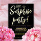 Eine neue, moderne, elegante Geburtstagsfeier für Erwachsene mit schwarzem Hintergrund mit handgeschriebenem, vergoldetem Typografietext, der "shh! It's a Überraschungs Party" sagt. Passen Sie diese Vorlagenkarte an, indem Sie Ihre eigenen Party-Informationen hinzufügen.