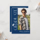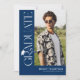 Feiern Sie Ihren Absolventen in zeitloser, eleganter Manier mit dieser modernen blauen und weißen Abschluss-Einladung. Vor einem stilvollen blauen Hintergrund zeigt das Design eine trendige weiße Serifen-Typografie mit dem Wort „GRADUATE“, das vertikal an der Seite herunterläuft und einen verfeinerten Blickfang schafft. Ein stilvolles Abschlussmützen-Symbol sitzt über dem Buchstaben „R“, während der fließende Schwung des Buchstabens sich in eine elegante Quaste verwandelt – und den Blick auf ein herausragendes Foto des Absolventen lenkt.