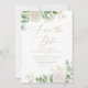 An elegant floral wedding Save the date card featuring white watercolor peonies and roses with greenery and modern delicate handwritten calligraphy.