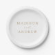 Die eleganten, personalisierten Hochzeitszettel-Teller sind perfekt für Ihre Hochzeitsfeier, Probe Dinner, Verlobungsfeier und vieles mehr! Die minimalistisch vergoldeten Hochzeitsfeiern sind ideal für Hochzeiten im Sommer, Herbst, Winter und Frühjahr. Das Design ist mit einem schicken, modernen Kalligraphieskript ausgestattet, in dem Ihre Namen in Goldschrift auf weißem Hintergrund dargestellt sind. Das Design koordiniert mit unserer Hochzeitskollektion "Moderne Elegance Gold".