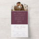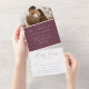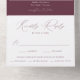 Elegante Hochzeitseinladung mit Ihrem Verlobung-Foto an der Spitze des Designs. Ihre Namen und Hochzeitsdetails werden in weißem Text mit modernen Kalligraphie-Schriftzeichen-Akzenten auf einem weinlila Hintergrund dargestellt. Das Design enthält eine abnehmbare RSVP-Karte unten, die als Postkarte an Sie zurückgeschickt werden kann. Entworfen, um mit unserer Hochzeitskollektion "Moderne Elegance" zu koordinieren.