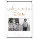 Die moderne, elegante Hochzeitskarte zeichnet sich durch ein minimalistisches Terracotta-Orange-Design aus. Die Tischnummer entspricht dem Alter des Paares und weist in diesem Alter schwarz-weiße Fotos auf. Personalisieren Sie mit Ihren Namen und Hochzeitstermin mit der leicht zu bearbeitenden Vorlage mit einem eleganten Script-Schriftart und klassischen Serif-Schriftart. Erstellen Sie so viele Tischnummern, wie Sie benötigen, indem Sie die "eine" zu Ihrer gewünschten Nummer ändern, die Fotos für sich austauschen und 1 Artikel in Ihren Warenkorb aufnehmen. Wiederholen Sie die Wiederholung für so viele Tischnummern wie nötig. Karo in der Kollektion "Modernes Elegantes".