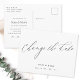 Individuell gestaltete Hochzeitsaufschiebung/Ändern der Datums-Postkarte mit modernem elegantem Schwarz-Weiß-Kalligraphiedesign.