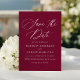 Ankündigen Sie Ihren großen Tag im Stil mit unserer eleganten Hochzeit speichern Sie die Terminkarten. Mit "Save the Date" in anmutiger weißer Kalligraphie auf einem weinbordeauxroten Hintergrund strahlt dieses Design zeitlose Eleganz aus. Paare können die Karte mit ihren Namen, ihrem Hochzeitstermin, ihrem Standort und ihrer Hochzeitswebsite personalisieren, die alle in fett weißer Schrift für ein glänzendes und einheitliches Aussehen dargestellt sind. Einfach, modern und klassisch, ist dieses Design der perfekte Weg, Ihre Hochzeitsdetails zu teilen und den Ton für ein unvergessliches Fest zu Set.