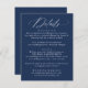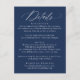 Diese Hochzeitsdetails-Umschließungskarte bietet "Details" in eleganter weißer Kalligraphie vor einem raffinierten marinen Hintergrund und schafft ein modernes und raffiniertes Aussehen für Ihre Hochzeitsstätte. Passen Sie die Karte mit Ihren Empfang-Informationen, Hotelunterkünften und der Hochzeitswebsite in fett weißer Schrift an, um Ihren Gästen alle wichtigen Details zu liefern. Das Design ist sauber, schlicht und zeitlos, und eignet sich sowohl für lässige als auch für formelle Hochzeiten zu jeder Jahreszeit. Egal ob Sie ein klassisches Fest oder eine zeitgenössische Veranstaltung veranstalten, diese Hochzeitsdetails-Karte verleiht Ihren Gästen eine elegante Touch und stellt gleichzeitig sicher, dass sie über alle nötigen Informationen verfügen.