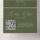 Elegante Hochzeitseinladung mit Ihrem Verlobung-Foto an der Spitze des Designs. Ihre Namen und Hochzeitsdetails werden in weißem Text mit modernen Kalligraphie-Schriftzeichen-Akzenten auf einem olivgrün Hintergrund dargestellt. Das Design verfügt über einen QR-Code, mit dem Sie Ihre Hochzeitsdaten online einsehen und Ihre Hochzeitswebsite einsehen können. Entworfen, um mit unserer Hochzeitskollektion "Moderne Elegance" zu koordinieren.