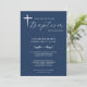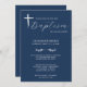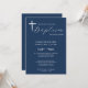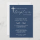 Moderne elegante Script Blue Taufe Einladung. Personalisieren Sie mit dem Namen des Babys, dem Datum der Taufe, der Lage der Kirche, der Adresse des Familienwohnsitzes und der UAWG.