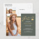 Diese doppelseitige 2-Foto-stilvolle Abschluss-Ankündigung oder danke Ihnen Postcard, verfügt über modernen Text verschmolzen mit eleganten Kalligraphie-Skript in goldfarben und weiß auf sage grün. Fotos sind vorne und hinten. Um mehr zu sehen, besuchen Sie meinen Shop hier unter "www.Zazzle.com/LakeViewCardCo". Danke
