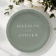Die personalisierten und eleganten Teller sind perfekt für Ihre Hochzeitsfeier, Probe Dinner, Verlobung und vieles mehr! Die minimalistisch grünen Teller sind ideal für Hochzeiten im Sommer, Herbst, Winter und Frühling. Das Design ist mit einem schicken, modernen Kalligraphieskript ausgestattet, in dem Ihre Namen auf weißem Schriftzeichen auf einem grünen Salbei stehen. Das Design koordiniert mit unserer Hochzeitskollektion "Modern Elegance Sage Green".