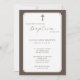 Moderne elegante Script Taupe Taufe Einladung. Personalisieren Sie Ihre Veranstaltung mit Details. Name des Babys, das getauft wird, Ort der Kirche, Ort des Empfangs und UAWG Informationen.