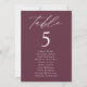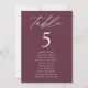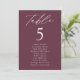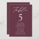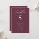 Elegante Hochzeitssitzkarte mit "Tisch" in weißem Kalligrafieschrift mit der unten abgebildeten Tischnummer und den Namen der Gäste auf einem Weinhintergrund. Das Design wiederholt sich auf der Rückseite. Um das Sitzdiagramm der Tischnummer zu bestellen, editieren Sie jede Karte mit der Tischnummer und den Namen der Gäste und fügen Sie es Ihrem Warenkorb hinzu. Entworfen, um mit unserer Hochzeitskollektion "Moderne Elegance" zu koordinieren.