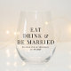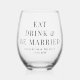 Modernes Edelweinglas für Ihren Hochzeitsempfang, Probe-Dinner, Verlobungsfeier und andere Hochzeitsfeiern mit "Eat Drink & Be Verheiratet", Ihren Namen und Ihrem Hochzeitsdatum in eleganter Typografie.