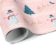 Modernes und festliches fa la la blush pink, Streifen Winter Szene Umhüllungspapier Design. Einfache, weiße Pinselstripe mit goldfarbenem Swirl-Design und festlicher Weihnachtsbaum und Schneemobil-Illustration in Imitaten. Die Hintergrundfarbe kann in Anzug Ihrer Vorliebe geändert werden. Original handgezeichnet Kunstwerk von Moodthology Papery.