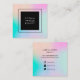 Diese stilvolle und lustige Visitenkarte bietet einen modischen pastellfarbenen holografischen Hintergrund in Blau, Grün, Rosa und lila Farbtönen mit einem schwarzen Quadrat. Personalisieren Sie Ihre Informationen sowohl auf der Vorderseite als auch auf der Rückseite, inklusive Social Media Icons auf der Rückseite.
