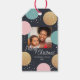 Ein moderner Weihnachtsgeschenktag mit bunten festlichen - goldenen Glitzer, rosa und blauen - Punkten. Der Ausdruck "Frohe Weihnachten" ist Set in einem skurrilen Schriftart. Personalisieren Sie diese Geschenkmarke mit Ihrem Foto und Text.