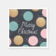 Eine moderne Weihnachtsserviette mit farbenfrohen festlichen - goldenen Glitzer, rosa und blauen - Punkten. Der Ausdruck "Frohe Weihnachten" ist Set in einem skurrilen Schriftart.