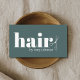 Moderne, vollständig anpassbare Visitenkartenvorlage mit fett formatierten Schriftart, grünem Hintergrund und Imitaten silberne Schere. Ideal für Friseur, Friseur.