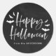 Feierliche und lustige Halloween-Aufkleber mit "Happy Halloween" in einem weißen, handgeschriebenen, modernen Drehbuch-Schriftart, betont durch fliegende Fledermäuse auf dunklem Chalkboard-Hintergrund. Personalisieren Sie diese benutzerdefinierten Halloween-Aufkleber mit Ihrem Namen oder einem anderen benutzerdefinierten Text. Ideal zum Abdichten von Umschlägen, Dekorieren von Halloween-Party-Gefälligkeiten und Hinzufügen einer festlichen Touch zu Geschenken, Leckerei-Taschen und vielem mehr.